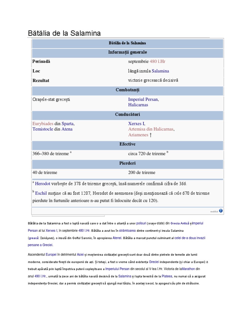 Bătălia de la salamina a fost o luptă navală care s a dat între o alianță a unor polisuri orașe state din grecia antică și imperiul persan al lui xerxes i în septembrie 480 î hr. în faţa lor 600 de corăbii pe plajă debarcând 25 000 de arcaşi şi suliţaşi însoţiţi de încă 1000 de călăreţi perşi ce abia îşi. Batalia de la salamina după ce regele persan darius nu reu ș e ș te să invadeze grecia în 490 î hr fiul său xerxes adună for ț e militare terestre ș i navale pentru a reusi sa infranga armata greaca. Tras un primer intento fallido jerjes emprende la deseada conquista de grecia.