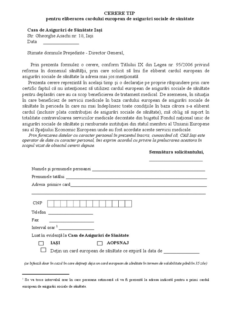 Cerere card european de sanatate. Cerere tip furnizată de casa de asigurări de sănătate. Domnule presedinte director general prin prezenta formulez o cerere conform titlului ix din legea nr. Formulare de completat pentru eliberarea cardului european de sanatate. Cerere card european duplicat documente necesare cost card european duplicat si cont de plata.
