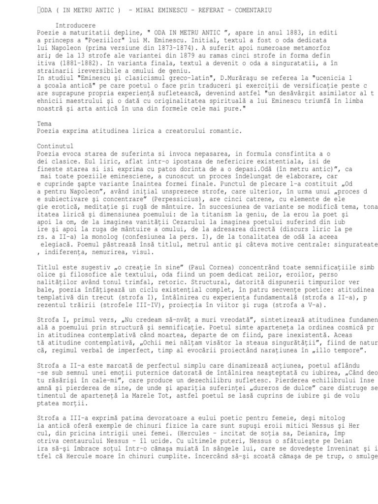 Comentariu oda in metru antic. Titlul operei oda mihai eminescu este sugestiv in ceea ce priveste specia literara si sentimentele de preamarire fiintelor aduse prin ea si specificul prozodic in metru antic. Citeste comentariu bac oda in metru antic incadrarea in perioada literara si curent literar. Poezia odă în metru antic este remarcabilă datorită faptului că ea conține o cheie fundamentală care atunci cînd ajunge să fie descoperită ne ofera o viziune cu totul inedită asupra realității. Romantismul este o mişcare literară şi artistică apărută în anglia care s a extins repede în întreaga europă marcând sf.