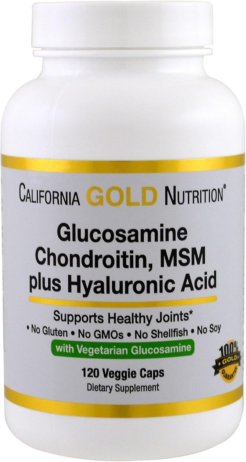 California gold nutrition glucosamine chondroitin msm plus hyaluronic acid features patented greengrown vegetarian glucosamine and optimsm methylsulfonylmethane plus bovine sourced chondroitin and non animal sourced hyaluronic acid.