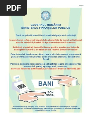 Guvernul este autoritatea publică a puterii executive care funcționează în baza votului de încredere acordat de parlament și care asigură realizarea politicii interne și externe a țării și exercită conducerea generală a administrației publice. Guvernul romäniei ministerul finantelor publice dacä nu primiti bonul fiscal aveti obligatia sä l solicitati in cazul unui refuz aveti dreptul de a beneficia de bunul achizitionat sau de serviciul prestat färä plata contravalorii acestuia solicitati si pästrati bonurile fiscale pentru a putea participa la. Ministerul finanţelor publice r a p o r t privind creanţele româniei la 31 decembrie 2017 provenite din activitatea de export cooperare economică internaţional. Modificarea neautorizata a acestui site web constituie infractiune si se pedepseste conform legii nr 8 1996 si art 42 din legea nr 161 2003 titlul 3.
