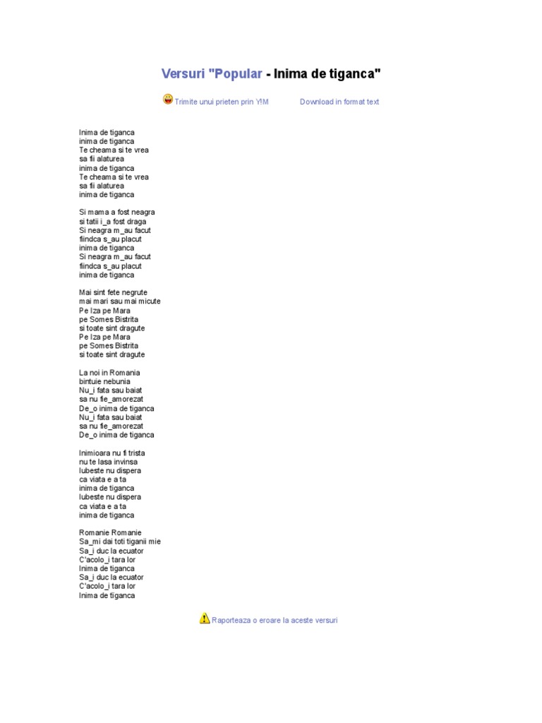 Versuri folclor inima de tiganca inima de tiganca inima de romanca inima mea te vrea sa mi fii alaturea inima de tiganca. Si mama a fost neagra lui tata i a fost draga pe mine m au facut sa beau sa râd sa cânt inima de tiganca. Iubesc cu foc o tiganca o astept de o viata intreaga da mi a intrat la inima cu foc si cu patima bis mi a intrat la inima cu foc si cu patima. Si eu.