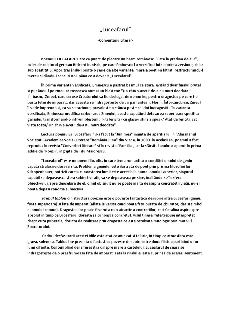 Luceafarul eseu pe scurt. Basmul original are un final tragic fata e ucisa de o stanca pravalita de zmeu peste ea si pe urmele ei feciorul de imparat moare de dor in valea amintirii. Dragostea lui mihai eminescu pentru folclorul naţional a fost profundă şi constantă poetul simţindu şi rădăcinile spirituale adânc înfipte în sufletul neamului românesc după cum mărturisea el însuşi într o însemnare făcută pe marginea unui manuscris. Luceafarul by caloalexandra calo alexandra with 12 541 reads poemul luceafărul a apărut în 1883 înalmanahul societăţii. Poemul este romantic prin amestecul genurilor si al speciilor imaginarul poetic e de factura romantica.
