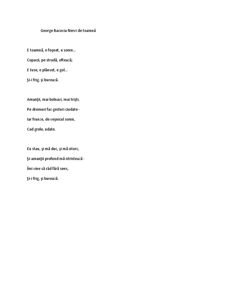 La toamna cand frunza va ingalbeni cand pentru ftizici nu se stie ce noi surprize vor veni alcoolizat batut de ploi cum n am mai fost candva tarziu in geamul tau incet cu o moneda voi suna. Eu stau şi mă duc şi mă ntorc şi amanţii profund mă ntristează. Nervi de toamnă de george bacovia e toamnă e foșnet e somn. Nervi de primăvară primăvară.