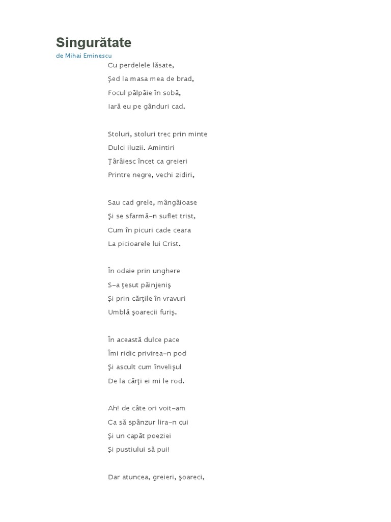 Singuratate de mihai eminescu. 3 responses to singurătate de mihai eminescu. Stoluri stoluri trec prin minte dulci iluzii. De mihai eminescu cu perdelele lăsate șed la masa mea de brad focul pâlpâie în sobă iară eu pe gânduri cad. în camera iluminată de pîlpîitul flăcării din sobă se proiectează chipul prizonierului al amintirilor.