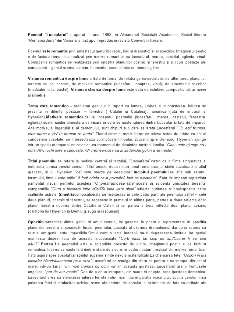 Luceafarul capodopera literara a poet ului nostru national culme a spiritualitatii romanesti a aparut initial la 1 aprilie 1883 in almanahul societatii academice social literare apoi in convorbiri literare la 1 august in acelasi an urmand sa fie introdusa in decembrie in volumul poesii. Poemul reprezinta o meditatie asupra destinului geniului in lume vazut ca fiinta solitara si nefericita opusa omului comun. Poemul luceafarul a aparut in anul 1883 in almanahul societatii academice social literare romania juna din viena si a fost apoi reprodus in revista convorbiri literare. Poemul luceafărul este un testament poetic care arată posterităţii modul cum eminescu şi a conceput propriul destin.